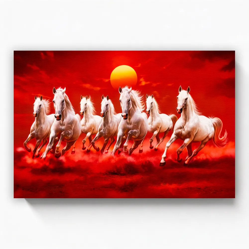 This artwork features seven majestic white horses running together in perfect harmony, symbolizing rapid progress, unity, leadership, and expansion. In Vastu Shastra, seven horses are considered highly auspicious, representing the seven rays of the Sun—each ray signifying growth, opportunity, strength, consistency, wealth, recognition, and stability in business.